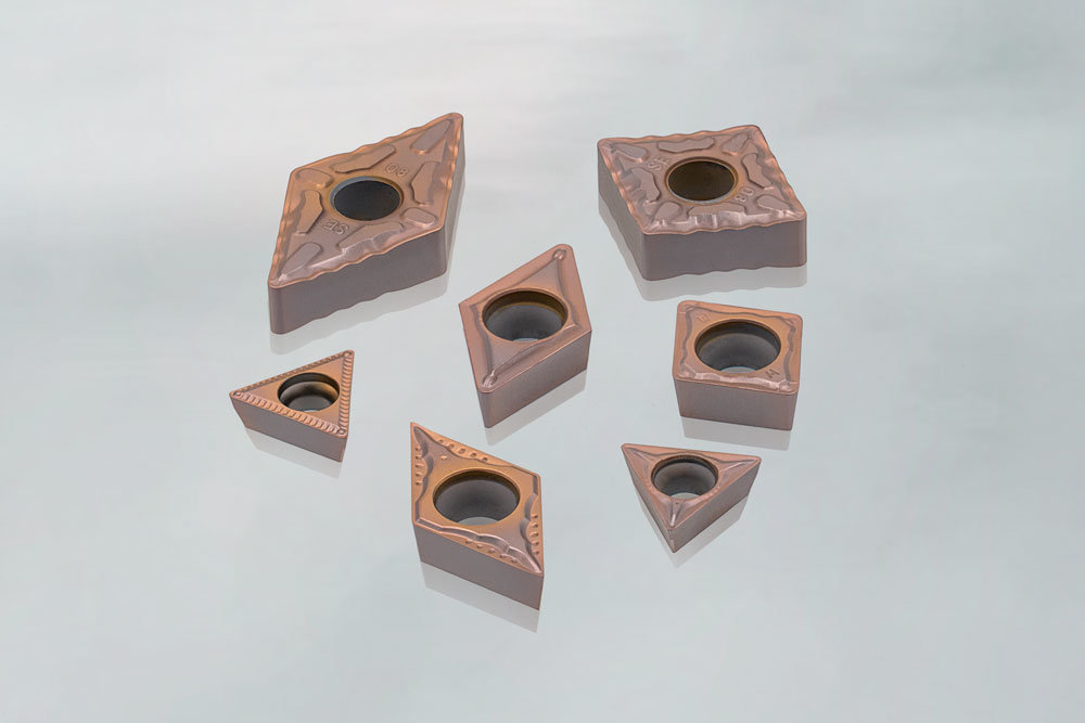 然而,金属陶瓷存在其材料特性导致的"耐崩损性不足"的课题,因此本公司重新审视了这种材料的合金组织,开发出韧性大幅提升的新型金属陶瓷合金。通过将这种新型金属陶瓷合金与高附着力的涂层技术相结合,实现了稳定的精加工和长寿命。产品阵容丰富,共有447个型号,广泛适用于多样的加工需求。