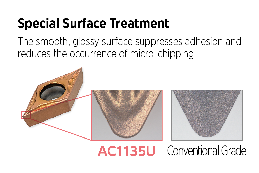 Additionally, we implemented our unique technology for special surface treatment to further suppress built-up edge. By combining these built-up edge and anti-chipping layers along with the special surface treatment, we developed a new coated grade: AC1135U that significantly contributes to reducing tool costs and the replacement frequency in small automatic lathe machining.