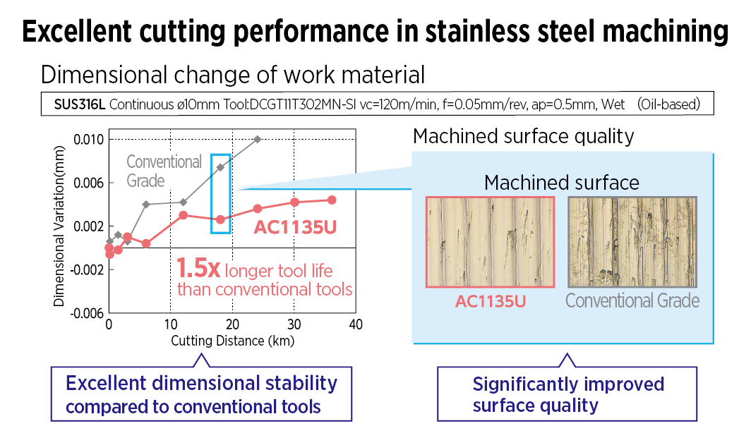 Since its launch in November 2025, AC1135U has received high praise. MicroCut Co., Ltd. has reported tool life improvements ranging from approximately 3 to 5 times, with a remarkable maximum of 12.5 times. Furthermore, we have achieved more than double the tool life across various sectors, including automotive parts, beverage packaging, medical products, and electrical components. Customers commend its stable performance across various materials, including stainless steel, steel, and copper.
