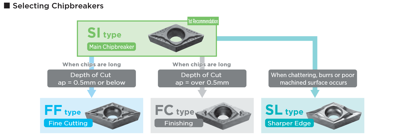 Additionally, by selecting the optimal chip breaker, customers can achieve the performance they desire. Our top recommendation is the SI type, while for those requiring sharper cutting performance, the SL type may be appropriate; thus, customers can optimize tool geometry alongside material benefits.