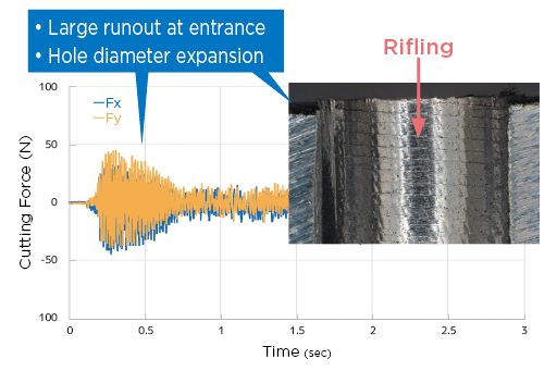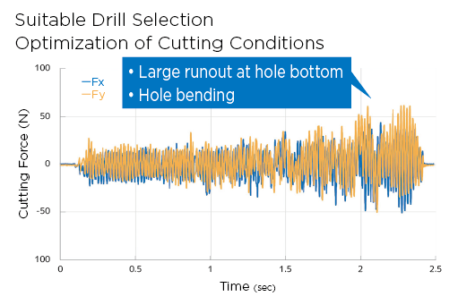 Detects hole diameter expansion and hole bending by visualizing cutting force changes on the XY plane.