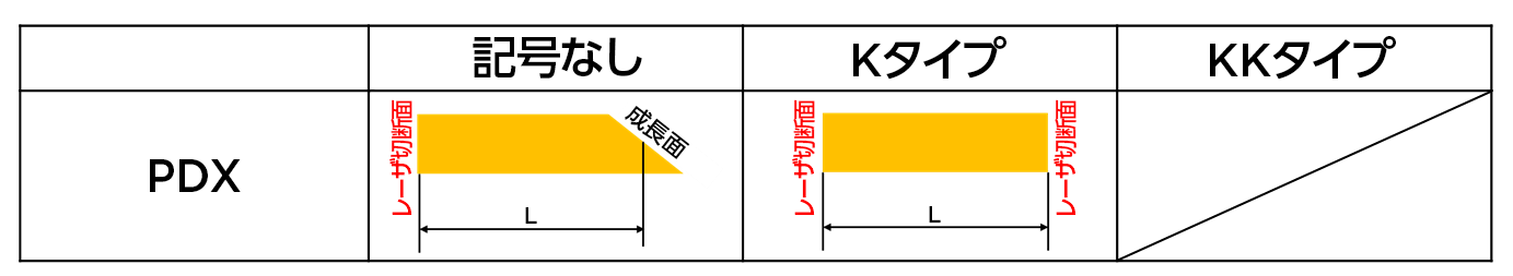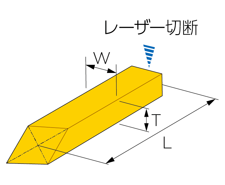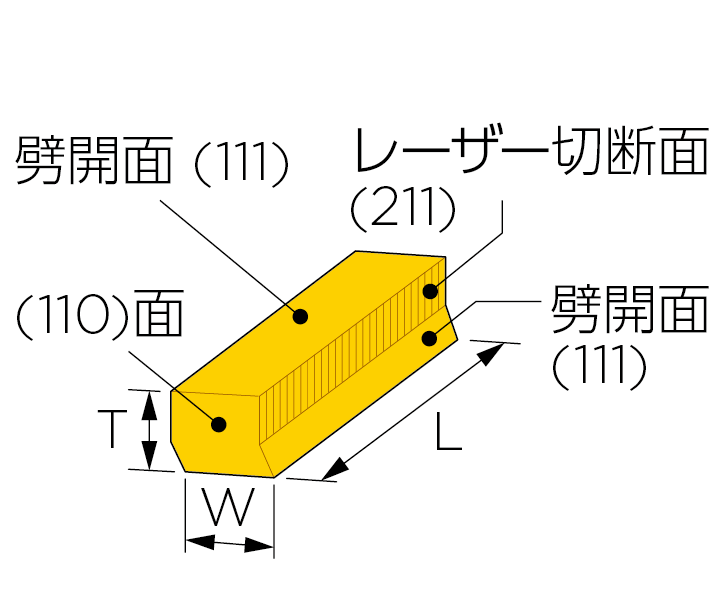 寸法Lは両端面の中心部を結ぶ距離を表します。上下面は劈開面(111)です。