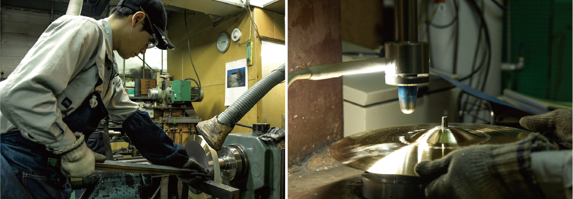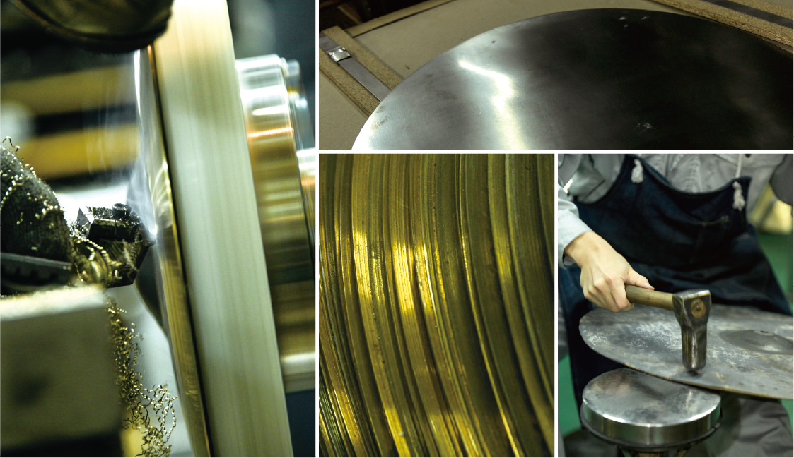 Cymbals made of bronze are said to have been produced since around 3000 BC. The manufacturing process is unique. High-tin bronze, an alloy of copper and tin, is fired in a furnace and then hot-pressed into a shape with a raised center while it is still soft. The material is then re-hardened several times and shaped by the spatula-drawing process. Then, the thickness and other details are adjusted by hammering and turning.