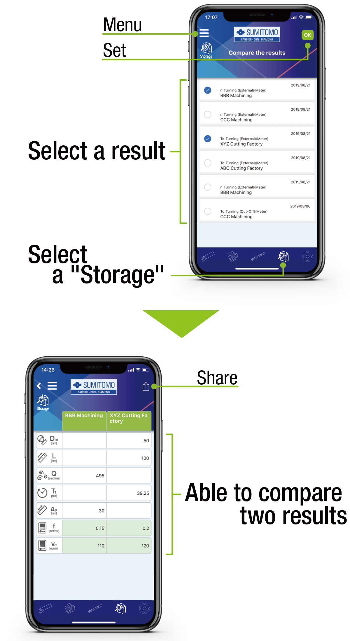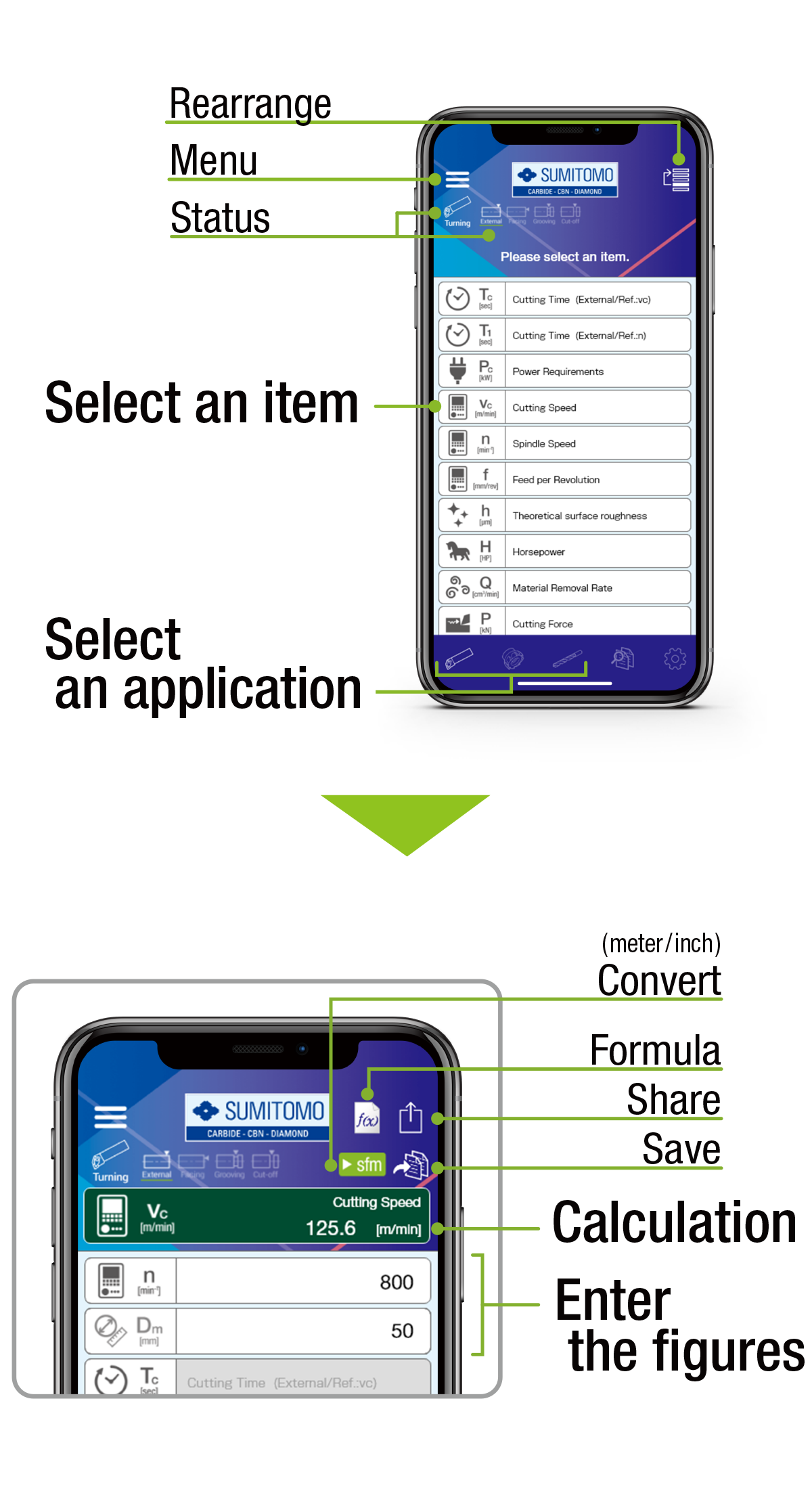 - *Units can be switched from metric to inch for the calculation results of cutting speed, feed rate per revolution, table feed and so on.