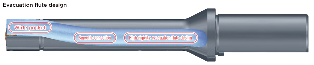 Proprietary flute design balances chip evacuation and holder rigidity at a high level. Machining vibration is effectively suppressed and cutting force reduced to realise stable deep hole drilling.