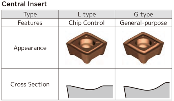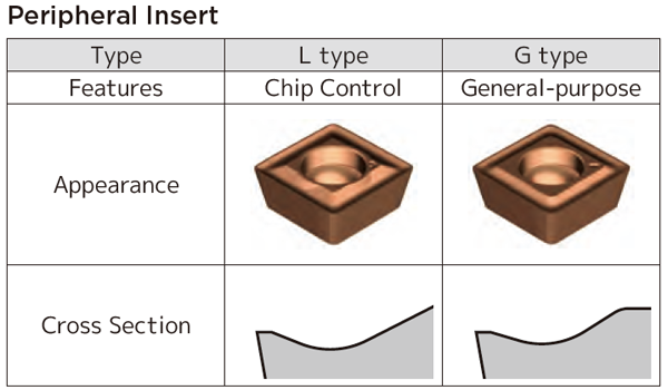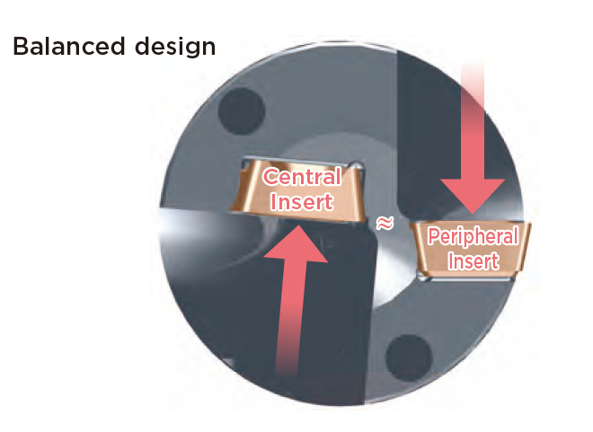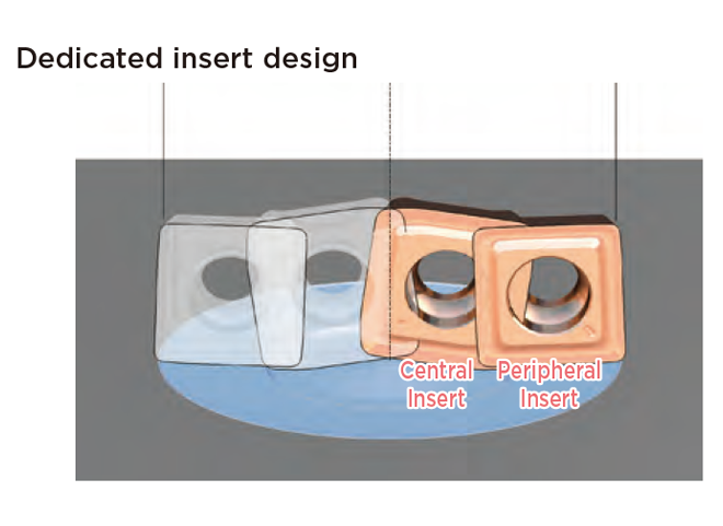 The central and peripheral insert designs have been individually optimised, improving stability with the optimal shape and relative positioning. In addition, the wiper flat shape has been optimised to achieve excellent machined surface quality.