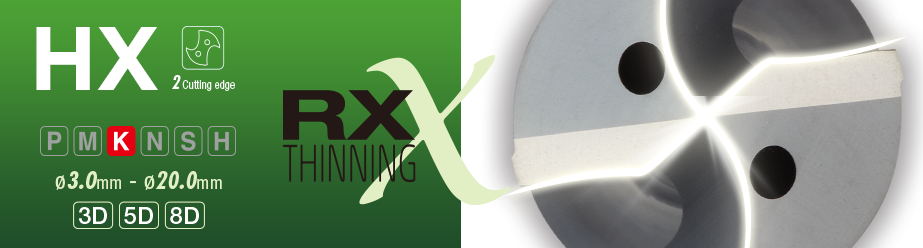 In addition, "RX-thinning" is used to significantly reduce cutting force to achieve high efficiency drilling with more stability (for ø10mm drills) and also allowing high efficiency drilling of more than vf=1,000mm/min.
