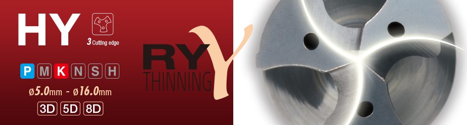 In addition, "RY-thinning" is used to achieve high efficiency drilling with reduced cutting force and is applicable to cutting conditions of more than vf=800mm/min for steel and more than vf=1,000mm/min for cast iron (for ø10mm drills).