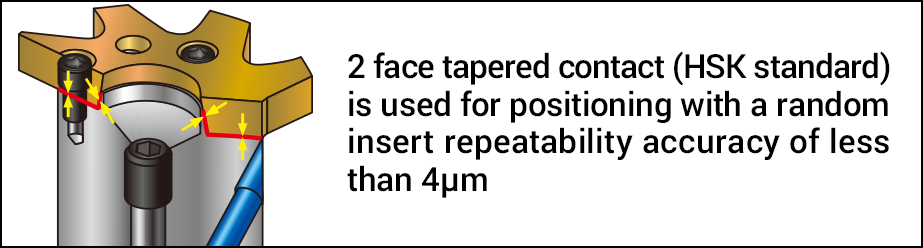 2 face tapered contact (HSK standard) is used for positioning with a random insert repeatability accuracy of less than 4μm