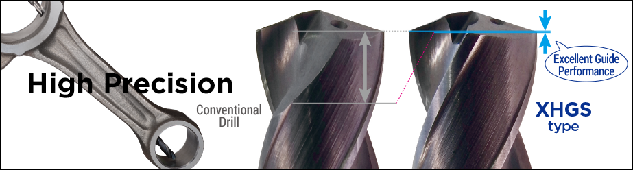 As compared to conventional, the distance from the cutting edge (main margin) to the sub-margin is shortened to provide stable and vibration-free machining right from the start of drilling.