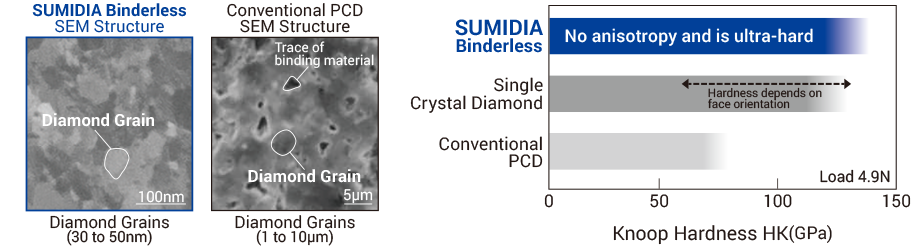 SUMIDIA Binderless is a polycrystalline diamond that directly binds nanometer-sized diamond particles with high strength without using binders. SUMIDIA Binderless is harder than single-crystal diamond and has no cleavability. Therefore, it enables machining of hard brittle materials such as carbides and enables new machining methods.