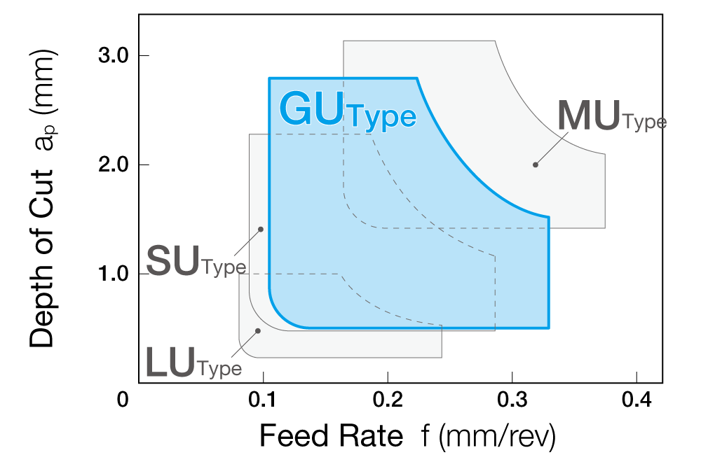Chipbreaker shape design characterized by a wide chip pocket has improved chip control over a wide range of cutting conditions. This prevents chip jamming during the cutting process and achieves stable machining. In addition to alloy steel, it is also applicable to various work materials, including carbon steel and stainless steel.