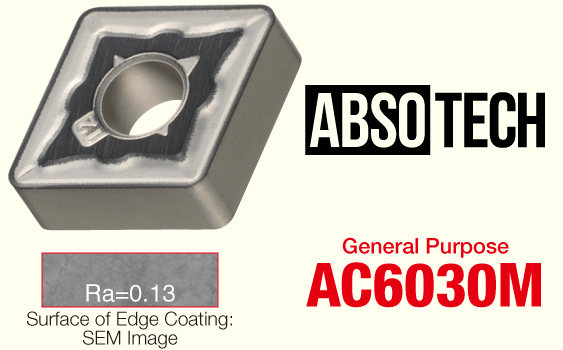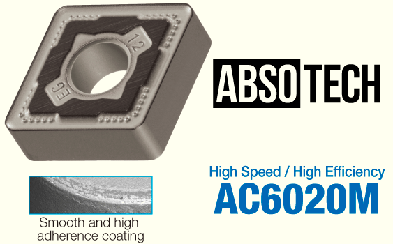 Grade for high speed and high efficiency stainless steel turning by the combination of new CVD coating "Absotech®" and hard substrate with high wear resistance, has excellent wear,chipping or peeling resistance.