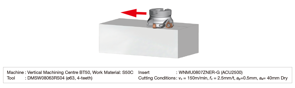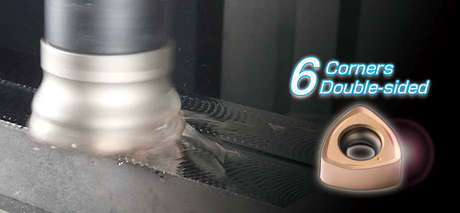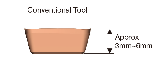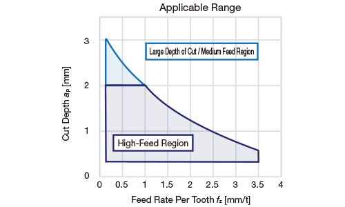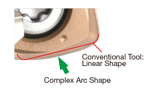 Complex arc-shaped cutting edge achieves a smaller cutting angle and a larger depth of cut simultaneously.High-efficiency machining at maximum feed rate per tooth of 3.5mm/t is possible.