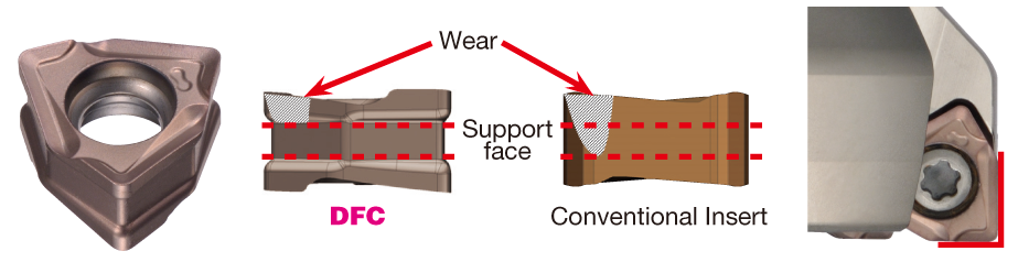 Flank wear of inserts for DFC series does not reach the restraining face and thus mounting accuracy does not suffer