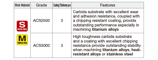 The optimized cutting edge shape together with newly developed ACS2500/ACS3000 grades (for machining exotic alloys) result in excellent wear resistance and fracture resistance