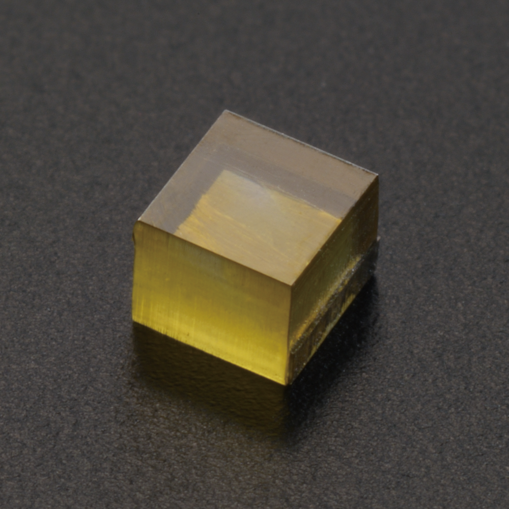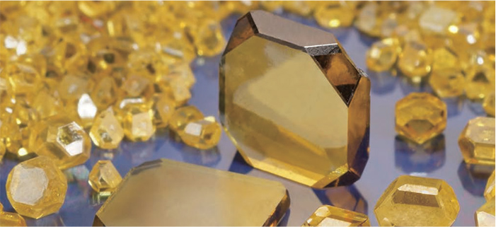 SUMICRYSTAL has 4 main advantages over natural diamond. 1) Structural advantage: Natural diamond is rounded and the crystal orientation is difficult to determine with the naked eye. SUMICRYSTAL, however, has a distinct crystal face which makes the identification much easier. 2) Uniformity: Due to the strictly controlled conditions in which the crystals are grown, uniform quality is obtained consistently. 3) Availability: Unlike the limited supply of natural diamonds, SUMICRYSTAL can be mass produced. 4) SUMICRYSTAL diamond type Ib, which is used for tools, has mechanical and thermal properties equal to or even greater than natural diamond, while containing small amounts of nitrogen.