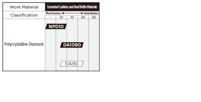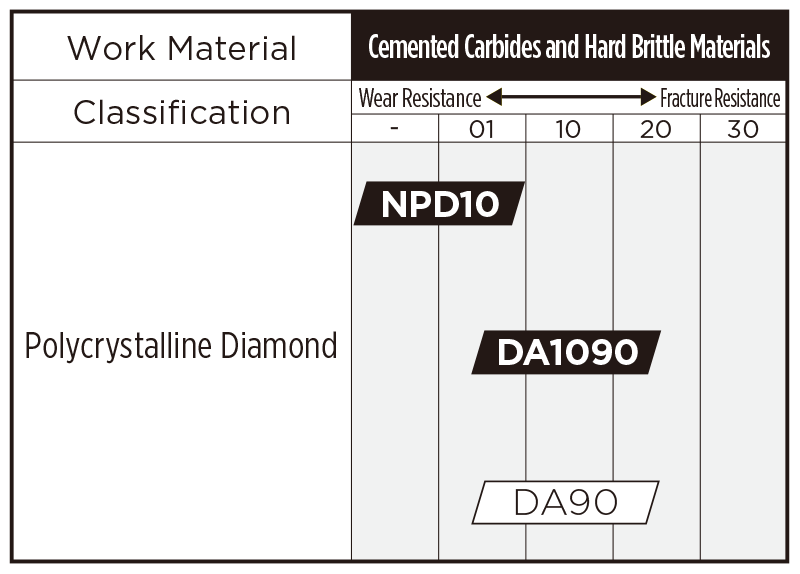 100% diamond that directly binds nano-order diamond particles with high strength. Demonstrates optimum wear and fracture resistance as well as the best edge sharpness