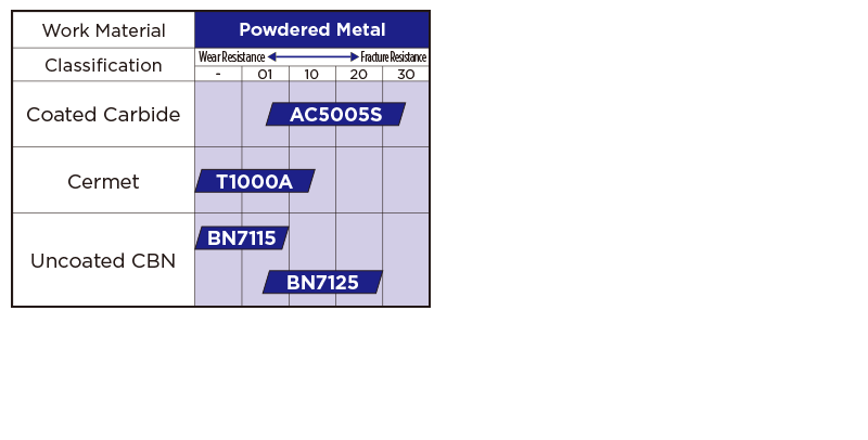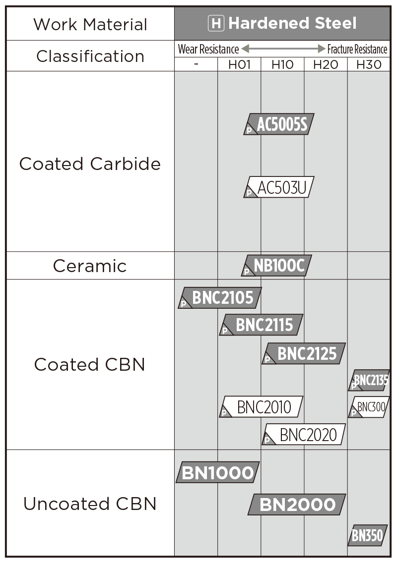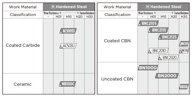 High-precision grade realizing long tool life with excellent surface roughness and stable machining. Maintains excellent surface roughness thanks to a high notch-wear resistant coating and tough CBN substrate