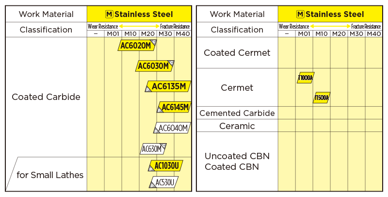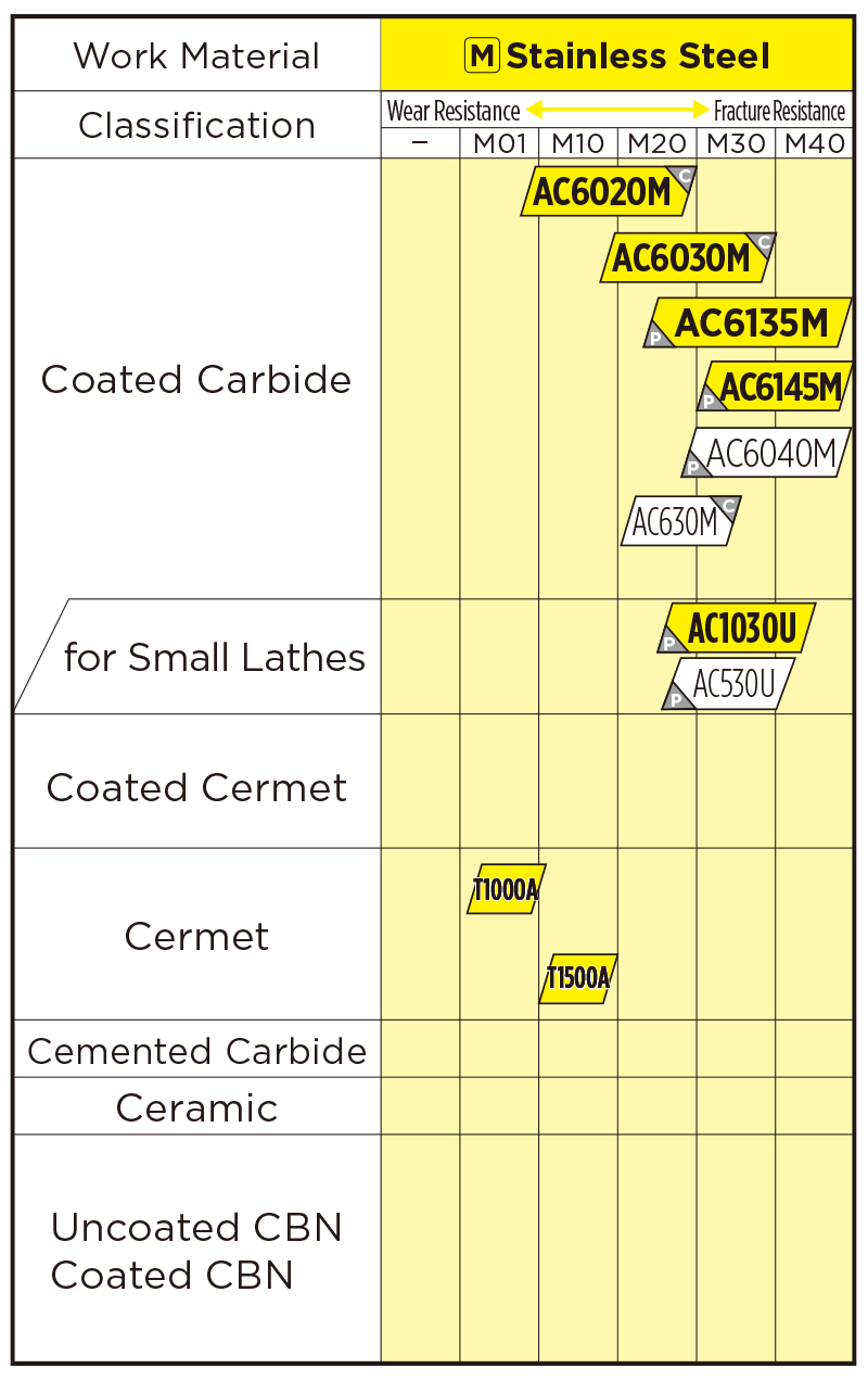 Our 1st recommended grade for turning of stainless steel, achieving long and stable machining. Drastically reduces the abnormal damage common in stainless steel machining, thanks to the improved coating strength and excellent adhesion