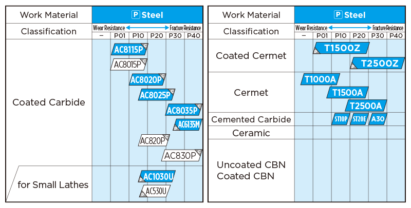 Our 1st recommended grade for turning steel. Surface smoothing technology significantly suppresses adhesion of work material components. Achieves long, stable tool life with various cutting speeds and work materials