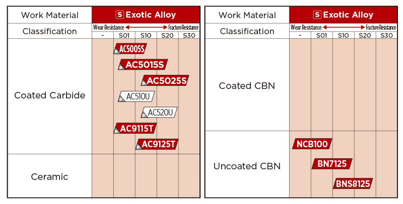 Our 1st recommended grade for turning exotic alloys as it realises stable tool life with high-speed, high-efficiency machining