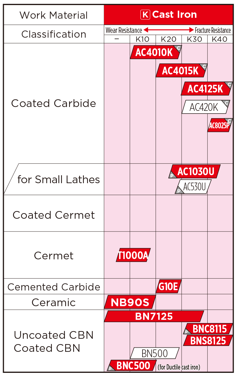 Our 1st recommended grade for interrupted turning of cast iron. Especially effective for stable long life in roughing of parts like differential cases and carriers.