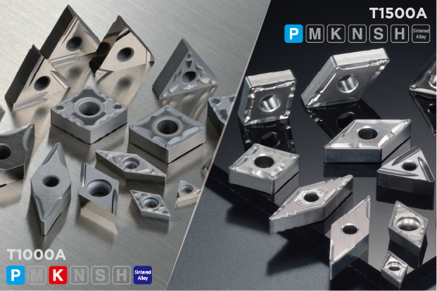 Uncoated Cermet Grades for Steel TurningT1000A / T1500ALineup includes T1000A, a high-hardness grade with superior wear resistance, and T1500A, a general-purpose grade that provides both wear and fracture resistance with higher-quality surface finishes