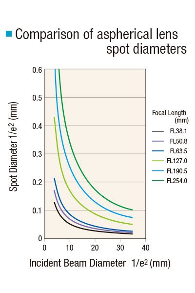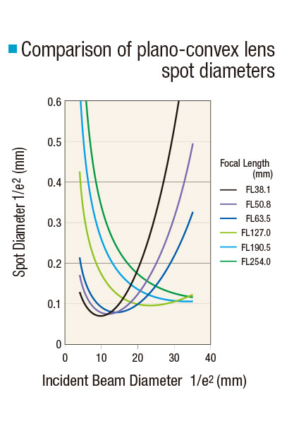 Lenses which minimize absorption of the laser beam, which has significant influence on processing quality, and realize high focusing performance and economy. We provide various lenses such as normal plano-convex lenses, meniscus lenses, aspherical lenses which realize high concentration, and pressure-resistant lenses used for laser processing machines. The adoption of an aspherical surface shape minimizes spherical and realizes a small spot size. It is effective for optical systems with a large incident beam diameter and a short focus.