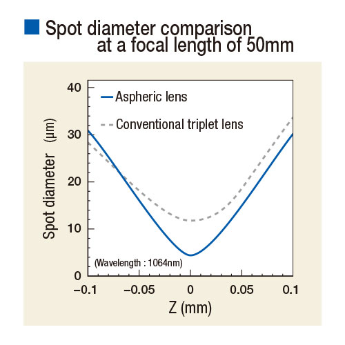 A spherical lens with spherical aberration shows differences in focal positions of light rays depending on their distances from the optical axis. Our aspheric lens realize smaller spot diameter than a conventional triplet lens by spherical lenses.