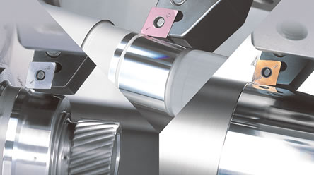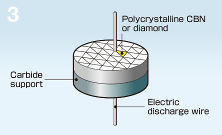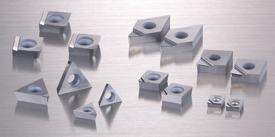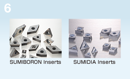 "SUMIBORON" is mainly CBN (Cubic Boron Nitride), a primary component to which special ceramics binder is added and is sintered under extreme pressure and temperature. On the other hand, "SUMIDIA" is a high density sintered diamond compact of ultra-fine diamond particles. Both of these materials have higher hardness and strength, along with excellent heat resistance, as compared to conventional tool materials.