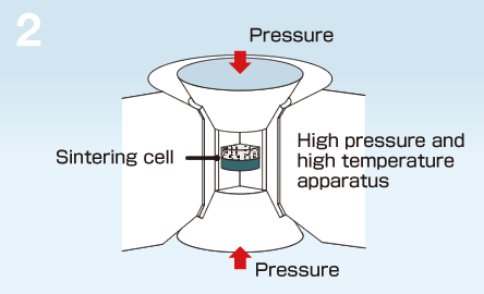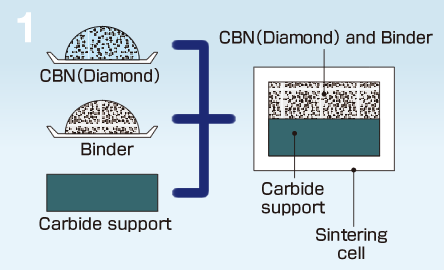 A special binder material is added to the CBN or diamond raw material powder, and the mixture is filled into a capsule with a carbide support.