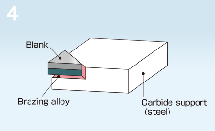 The cut sintered compact blank is brazed onto cemented carbide or steel etc.